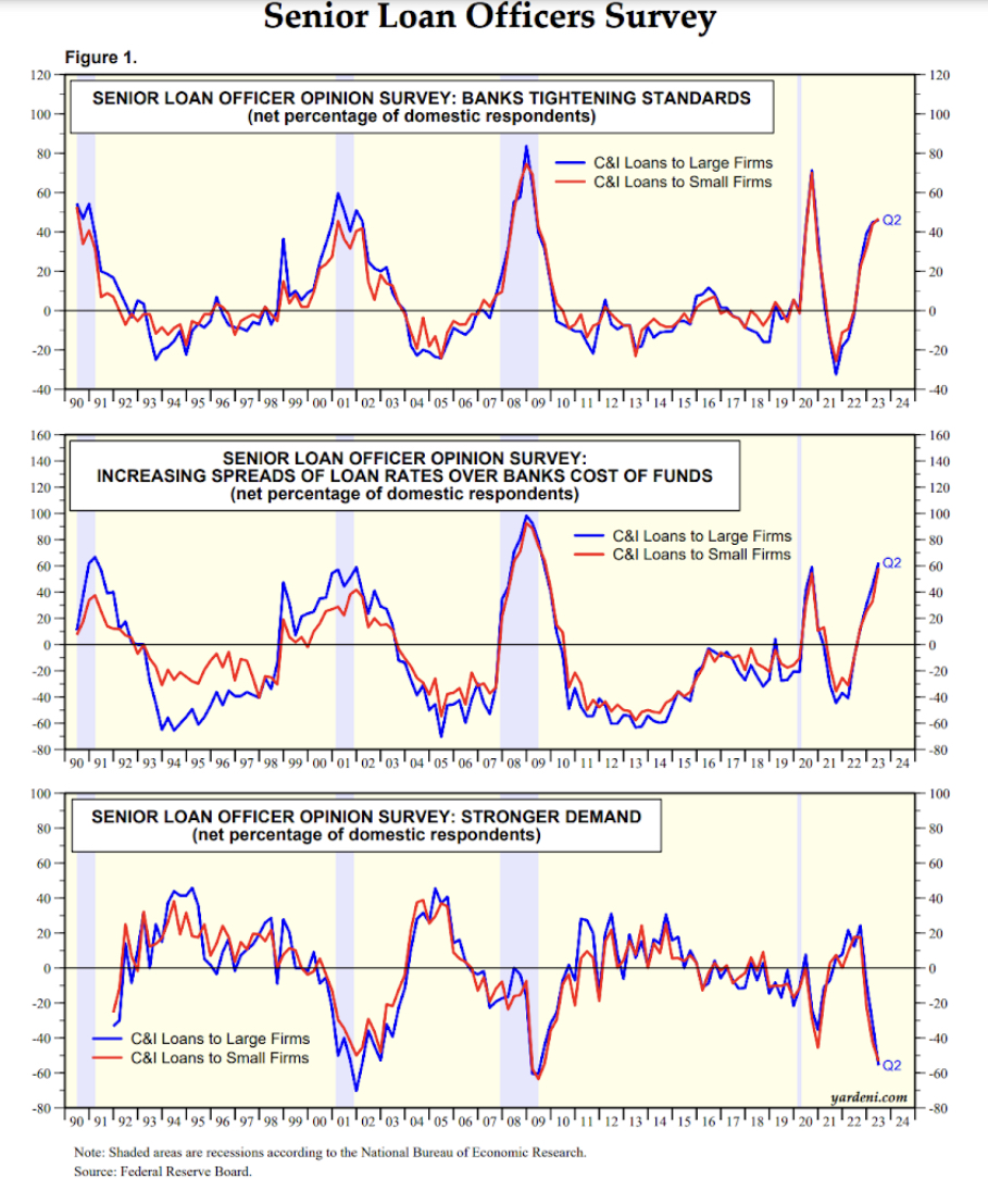 미국 경기침체 가능성을 객관적으로 판단하기 위하여 미국 연준에서 매분기 발표하는 Senior Loan Officer Opinion Survey 지표를 공유드립니다. SLOOS와 미국 경기침체와 매우 상관성이 높다.